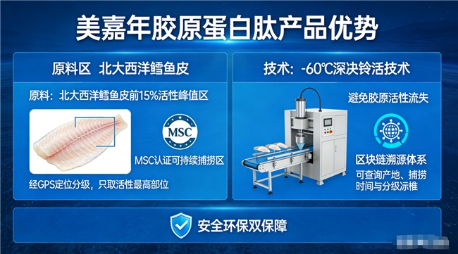 (1)顶级原料溯源:100%采用北大西洋深海鳕鱼皮提取胶原蛋白肽,该海域水温常年低于6℃,鱼类胶原纤维结构更致密,热变性温度高出普通鱼源12℃,活性稳定性更强。