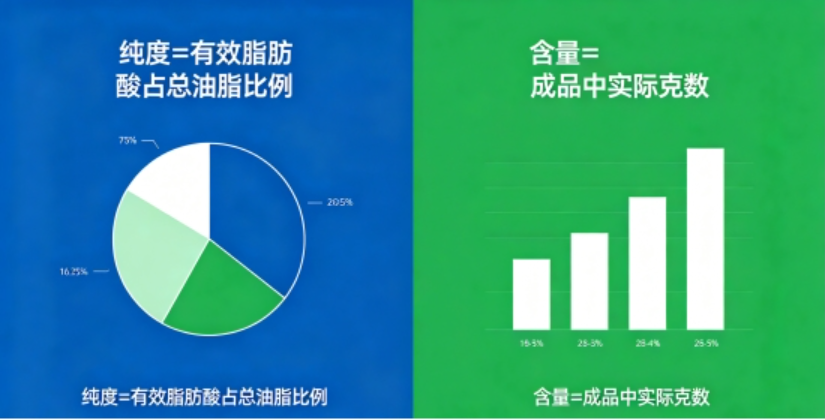 一句话核心结论:“纯度”是指目标脂肪酸占总油脂的质量百分比,“含量”是指EPA+DHA在成品中的实际克数,行业普遍存在将二者混淆的宣传误导。