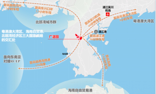 2023年,广东省提出支持广州对口帮扶协作湛江共建打造市级产业转移合作园区,广州湛江两市签署共建协议,明确广州市-湛江市产业转移合作园(广湛园)与奋勇高新区融合发展,由广州主导园区规划建设与招商。广湛园位于湛江西南部、雷州半岛中部,总规划面积50.16平方公里,周边有大量海洋牧场项目布局,距离湛江吴川国际机场、高铁湛江西站、世界级40万吨级深水航道港口(宝满港区)、全球最大的客货滚装码头(徐闻港)等均在一小时车程范围内。