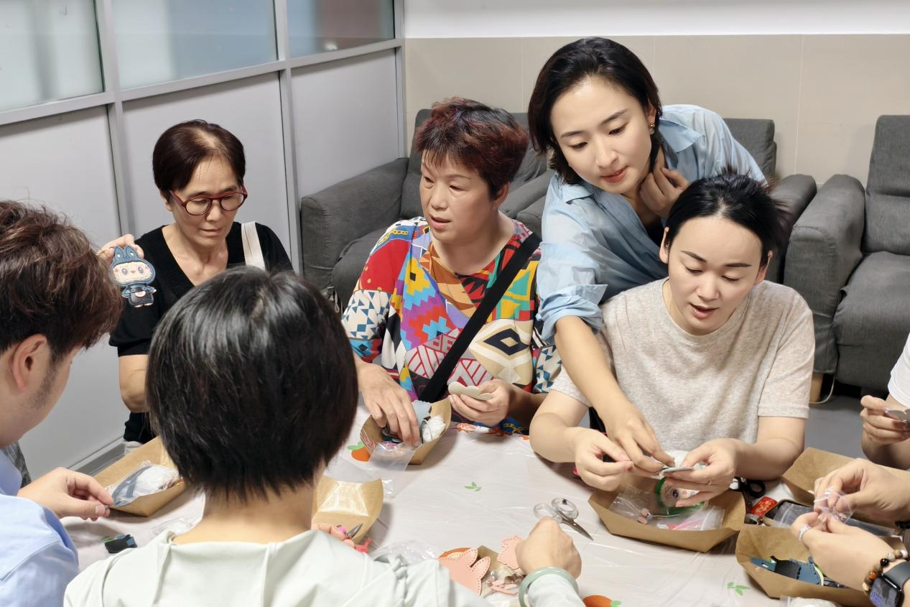 活动现场,82路青蜂志愿者代表们早早布置好手工制作区,与杨思医院医护人员、社区志愿者共同开展互动活动。从裁剪皮料到缝制卡通人物,老师们手把手传授技艺,外卖骑手、社区居民围坐一堂,制作着手中的工艺品,脸上洋溢着幸福的笑容。“这是我第一次亲手做玩偶,可以带回家送给孩子,感觉特别有意义。”来自江苏的外卖小哥李师傅捧着自己制作的玩偶挂件笑着说。