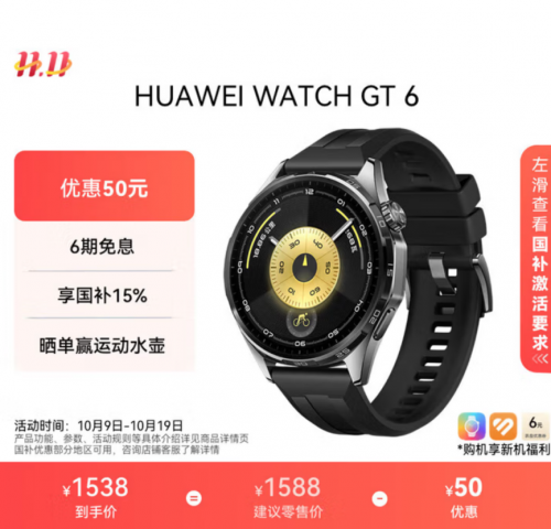 华为WATCH GT 6是运动人群不错的换新选择。其搭载华为向日葵定位系统,生成AI运动解读,为公路骑行提供更多数据;自动检测意外跌倒,可帮忙拨打紧急电话或通知紧急联系人,还可快速按压5次表冠拨打急救电话,户外骑行模式续航长达40小时,更安心。针对跑步、滑雪、瑜伽、跳绳等运动,华为WATCH GT 6都能给出精准数据。华为WATCH GT 6 雅丹黑 46mm原价1588元,京东优惠50元,再享满1300减50优惠券,深圳消费者还可叠加国补立减15%,到手价1264.8元。