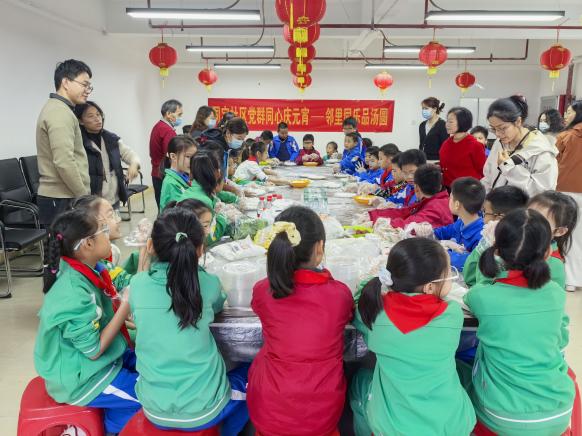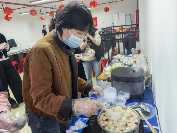 猜灯谜环节过后,包汤圆活动让现场氛围愈发暖意融融。在党员志愿者的示范带领下,大家围坐成圈,戴上手套有条不紊地投入到汤圆制作中。大家揉糯米团、搓汤圆,将对团圆美好的祝福包进小小的汤圆里。社区工作人员用生姜、红糖、鸡蛋、红枣、枸杞等材料熬制出来的汤底芳香四溢,热气腾腾的汤圆出炉,大家共同品尝这份亲手制作的甜蜜汤圆。“虽然今天下雨有点凉,但吃着自己包的汤圆,心里暖烘烘的!” 一位参与活动的居民感慨道,这场活动不仅让大家体验了传统习俗,更拉近了邻里之间的距离。