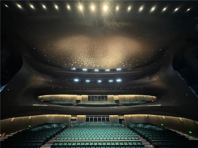 剧院观众厅内墙与天花采用“音律森林”设计理念,安装超十万根定制化GRG装饰棒,涵盖28种差异化规格、最短不超4厘米。每根装饰棒的法线方向均各不相同。面对双曲面上超10万根不同规格装饰棒无序拼装难题,中建一局项目团队“全站仪定位+三维扫描”三位一体施工方案。1:1构建数字孪生模型进行模拟推演,通过多轮“光影实验室”样板测试,将单根装饰棒的安装误差成功控制在0.5mm以内,实现了整体曲面的视觉连贯性与声学聚焦功能,让观众既能感受视觉上的曲面美学盛宴,又能体验声学聚焦的完美音效,尽享顶级观演感受。(解晶煜、欧迪鹏)