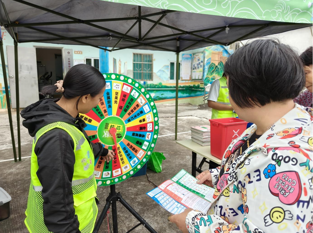 最吸引人的当属互动游戏区。在垃圾分类卡片模拟投放摊位前,四色迷你垃圾桶整齐排列,村民们排起长队跃跃欲试。只见一位村民手持“指甲油”卡片,略作思索后稳稳投入灰色“其他垃圾”桶中,引来一片叫好声。“这个好!以前光听讲记不住,动手分一次就牢牢记住了。”阿姨笑着说。一旁的转盘游戏同样受欢迎,转盘上标注着各类垃圾名称,参与者转动转盘,指针停下后需迅速说出对应分类。答对的村民就能获得一份实用的小礼品,更在趣味挑战中巩固了分类技能。